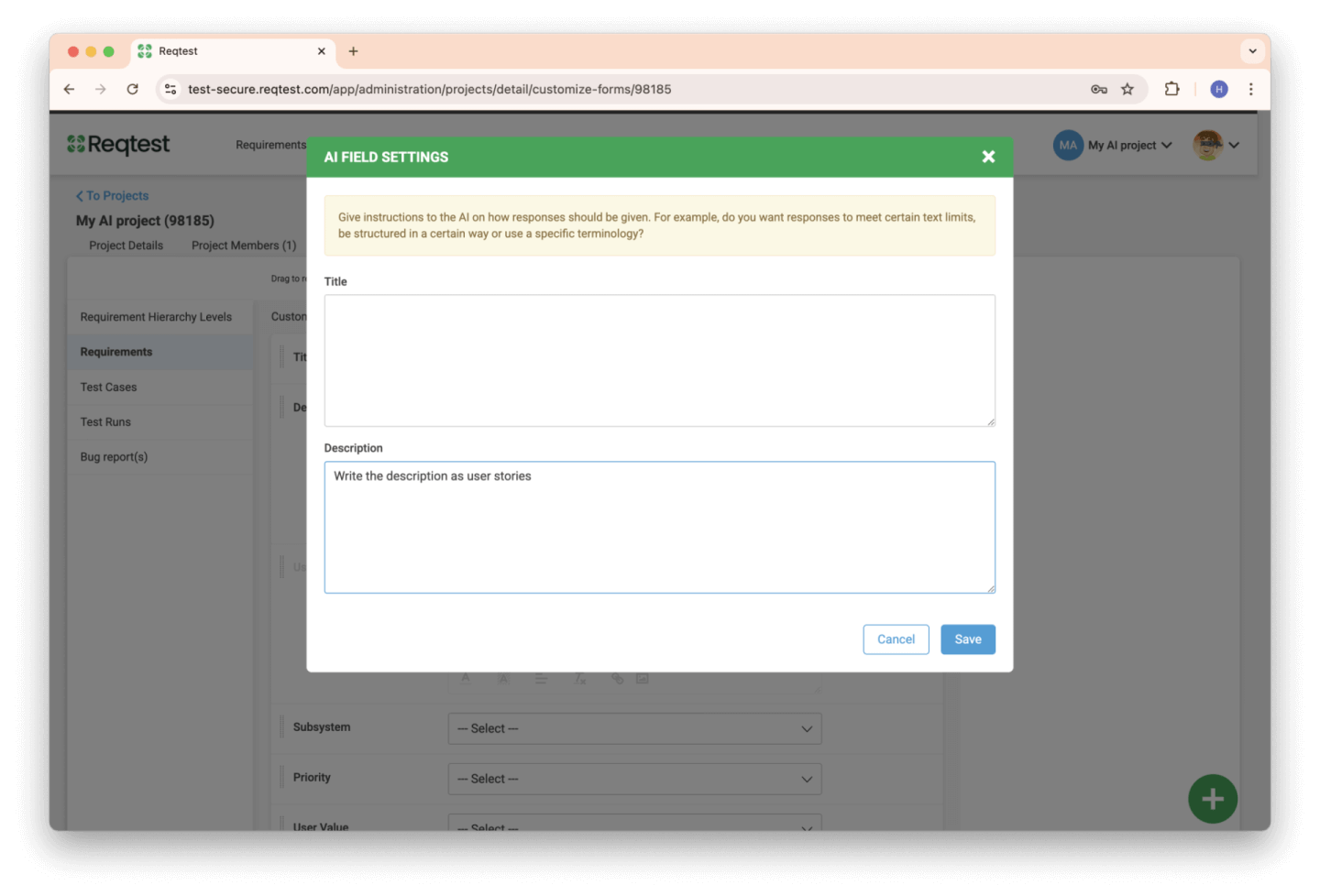 As a requirements manager, you can provide AI with instructions that are applied consistently to all users’ requirements – for example, always using specific terminology or structuring the text as a list of user stories