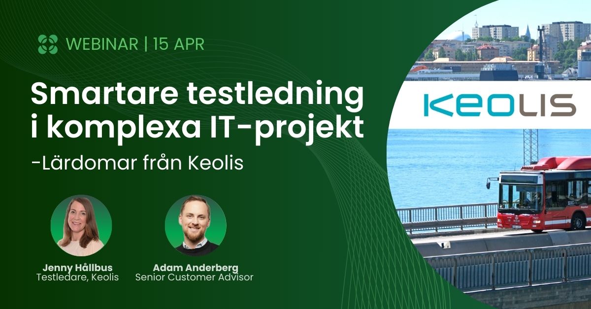 Hur tar man kontroll över kvaliteten och ökar effektiviteten i sin digitalisering? I det här webbinariet delar Jenny Hållbus, testledare, med sig av sina erfarenheter från Keolis pilotprojekt – det stora införandet av ett nytt EAM-system. Hon kommer dela vilka utmaningar de stod inför, hur de tog kontroll över kvaliteten och lärdomar från det nya arbetssättet.