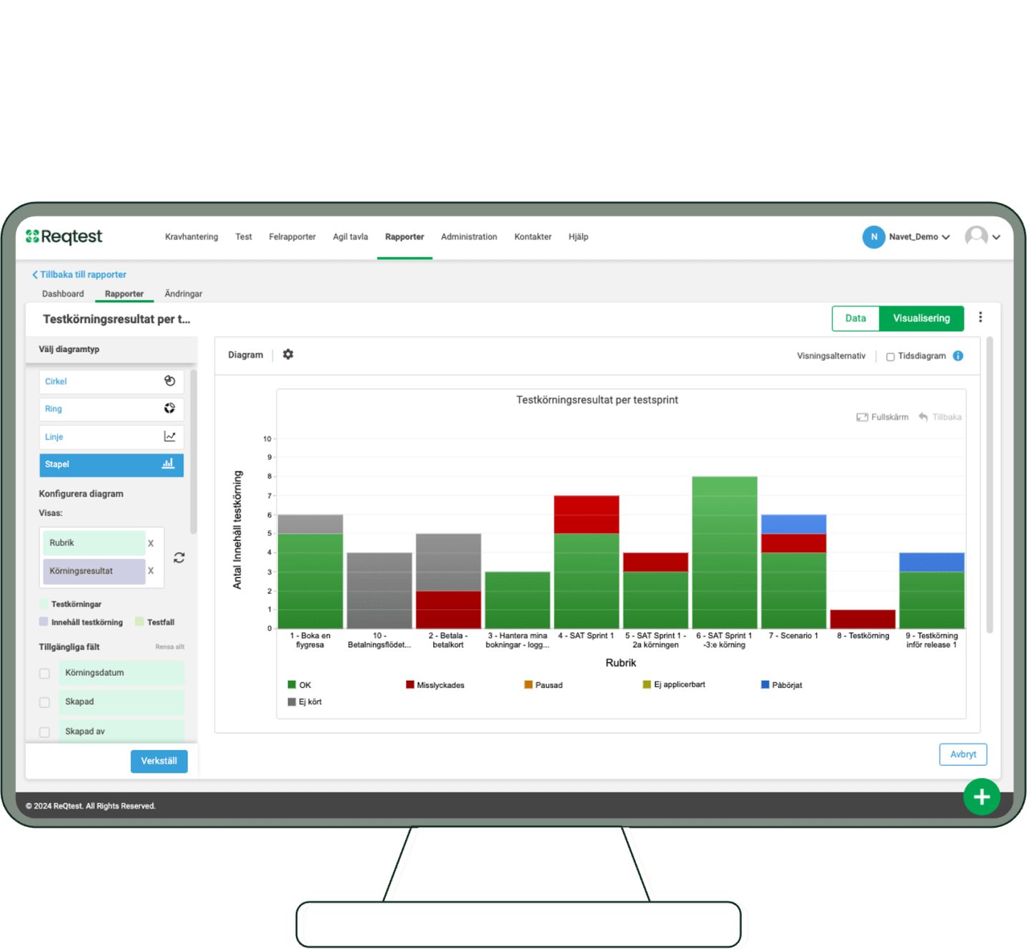 Håll koll på status och progress i projektet med Reqtest rapportmodul. Du kan även bygga dina egna grafer, skapa dashboards och dela insikterna med ditt team.