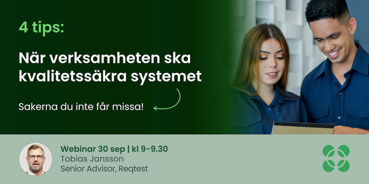 En nyckel för att lyckas med ett större systemprojekt, som affärssystem, EAM, HR- eller ekonomisystem, är att involvera verksamheten i kvalitetssäkringen. Men vilka är de största fallgroparna och hur säkerställer du att projektet lyckas? I det här webbinariet får du koll på 4 viktigaste punkterna för att ta projektet från svagt till succé!