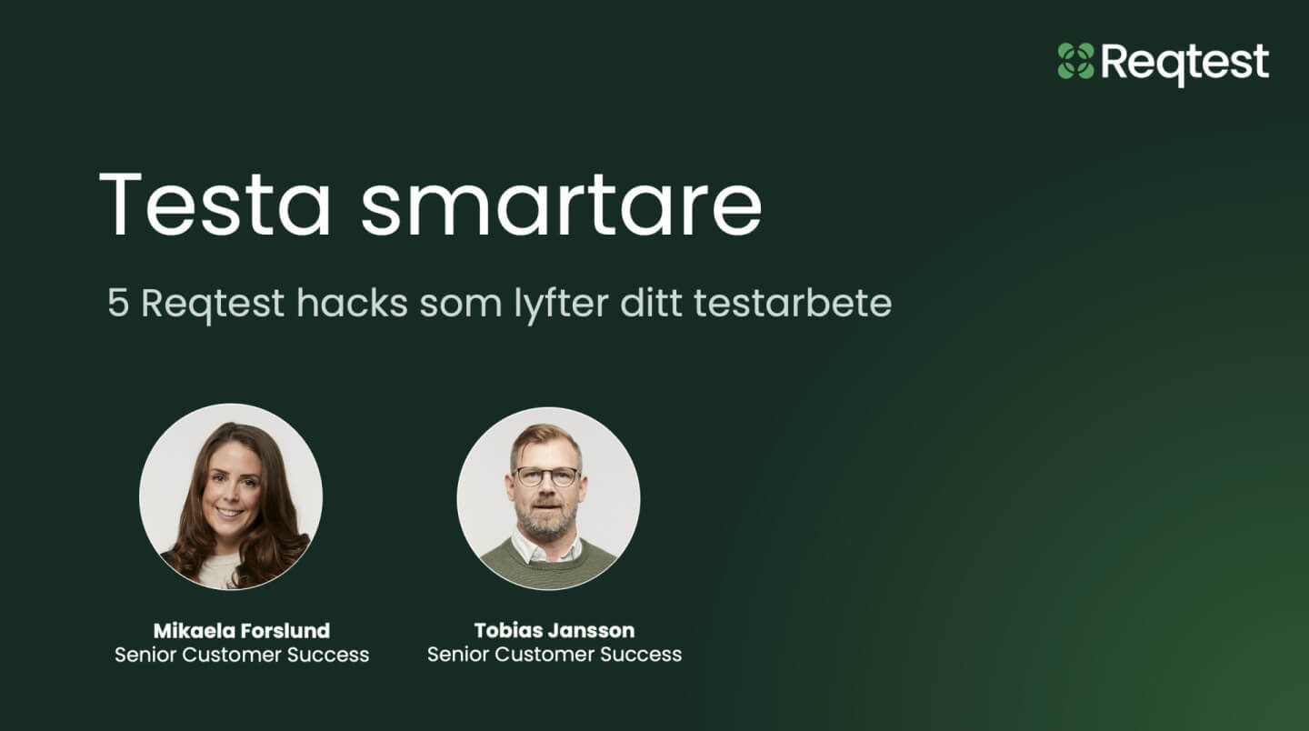 Att kvalitetssäkra ett IT-system är ett viktigt och tidskrävande arbete. Men det finns sätt att jobba smartare så att du både kan spara tid och öka kvalitén i dina projekt. I det här 30 minuter långa webbinariet kommer du lära dig 5 hacks för att effektivisera testfasen och kvalitetssäkringen i Reqtest.